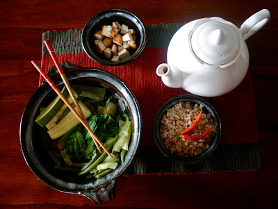 Drain the soup into a tea-pot. Put the rice at the bottom of bowls, add the vegetables and meat and garnishes and gently pour the soup over.