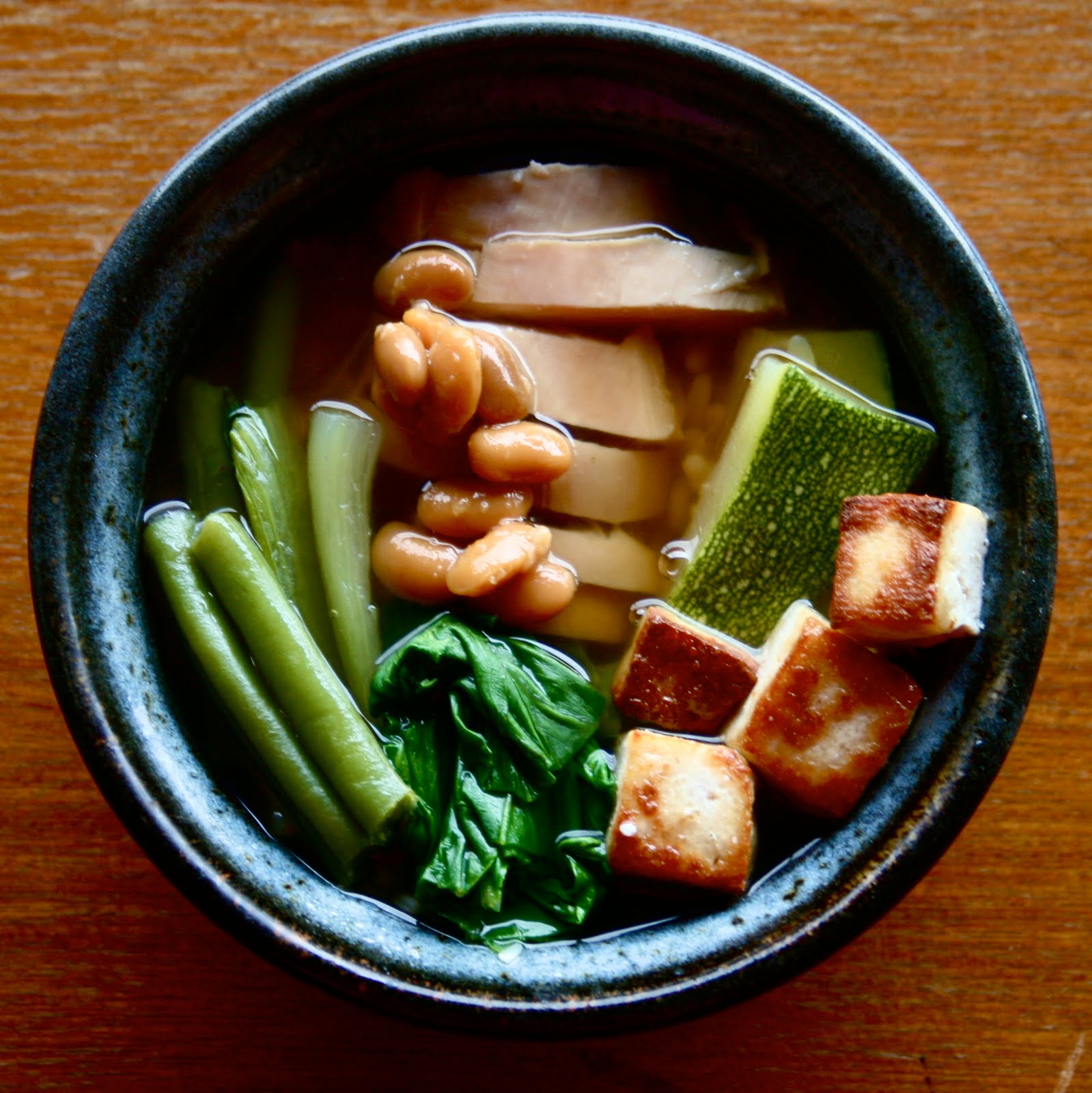 Slightly more complicated but more fun to eat: Spoon out about 3 cups of the hot soup into another pot on the simmer. Put the chicken (if using) into the original pot to cook. In the new pot, start blanching your veggies, one set at a time using a slotted spoon to drain. When you’re done with all, empty the hot, veggie broth back into the main pot of soup!